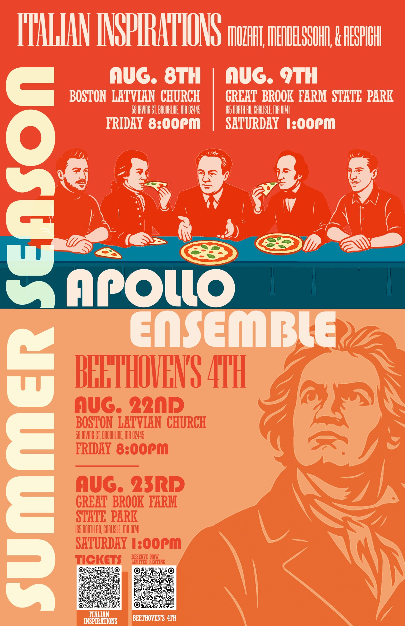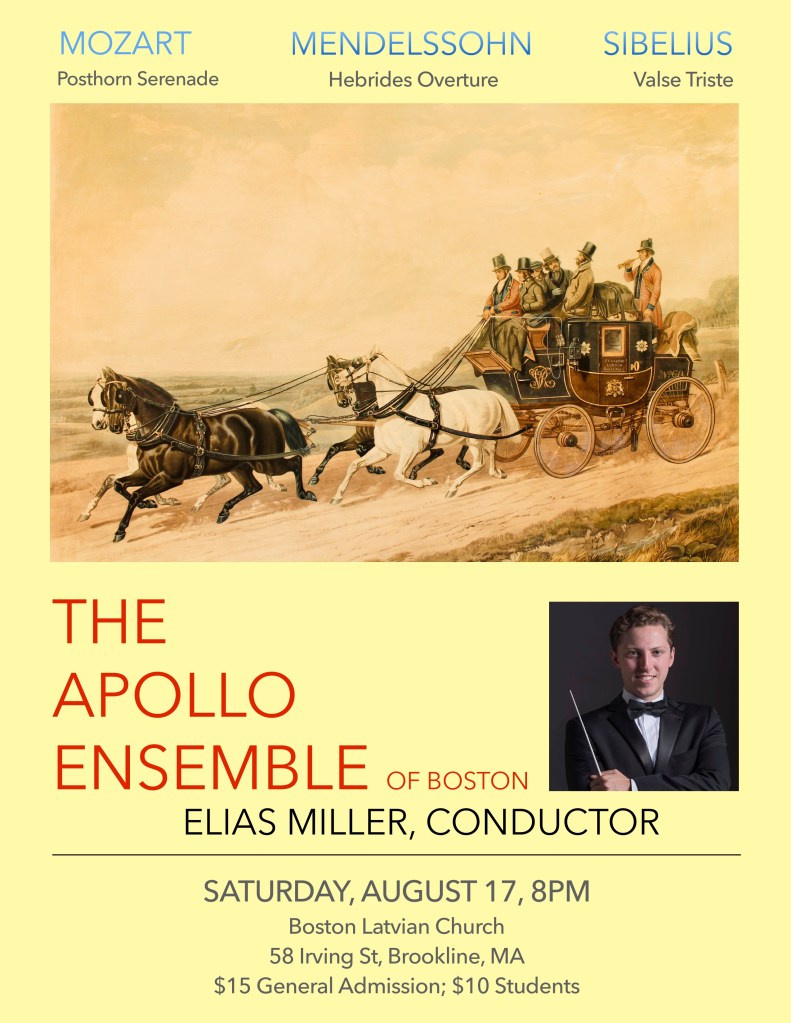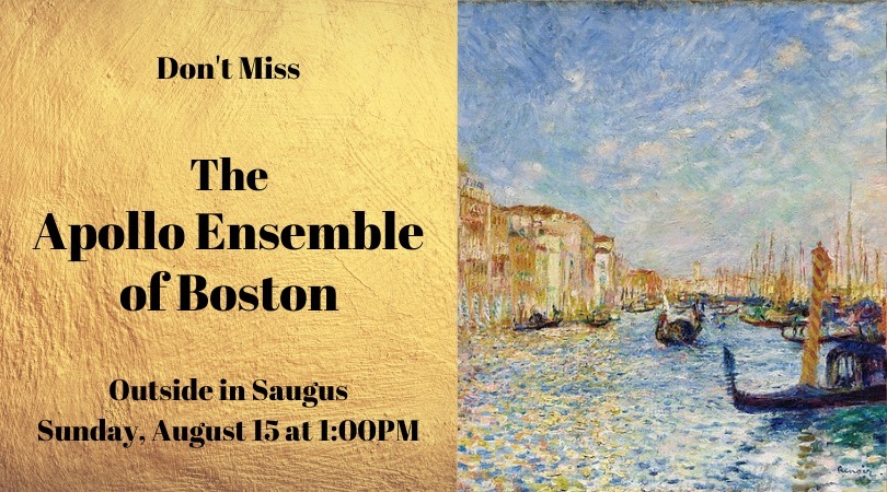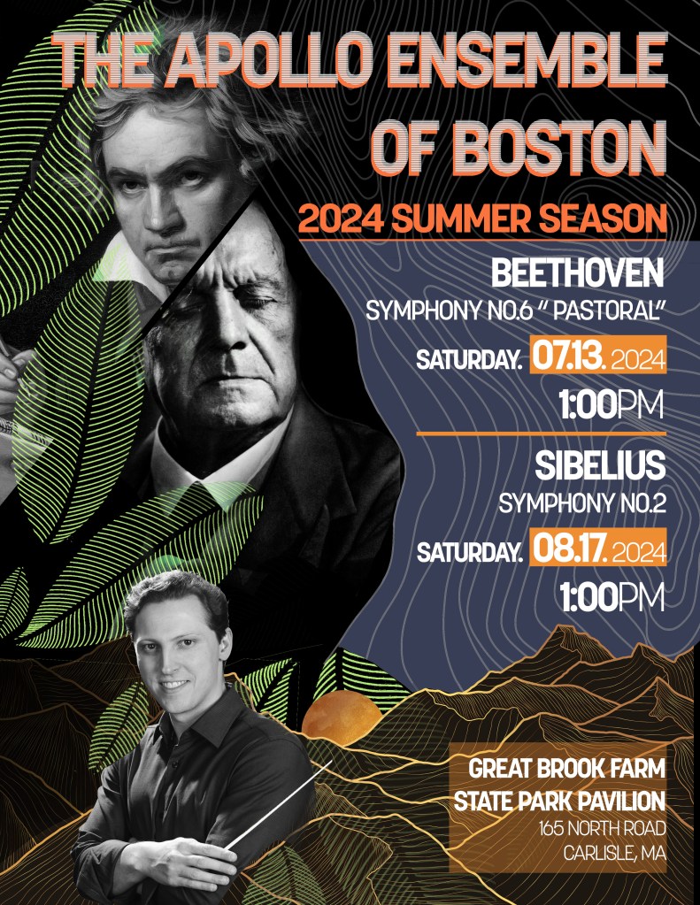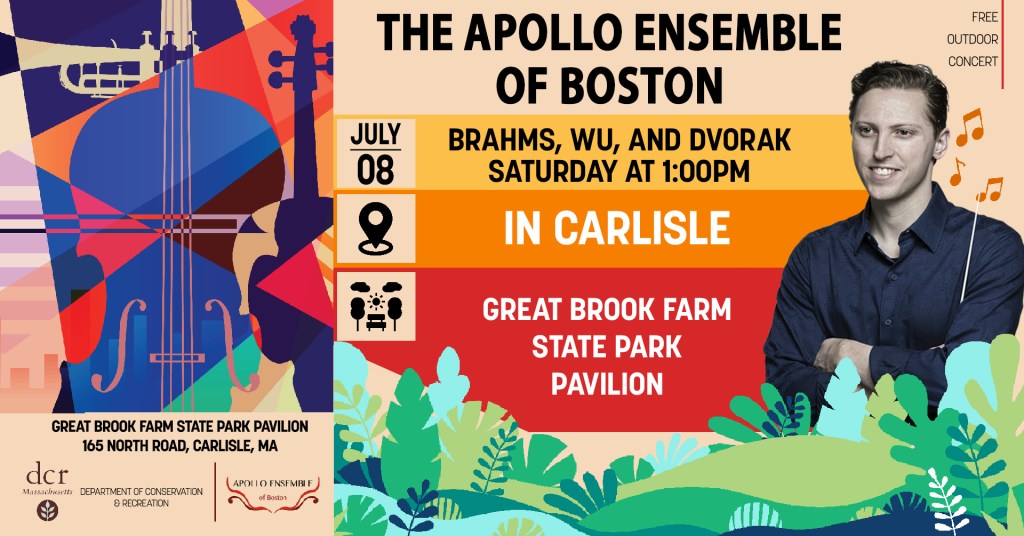 The Apollo Ensemble performs a masterworks concert series featuring 5 concerts in Boston Area venues and a summer season featuring 2 outdoor concerts in Massachusetts state parks and 2 indoor concerts in Brookline. Apollo also performs two “Neighborhood Notes” community run-out concerts and an annual in-school education concert for community music students in Boston.